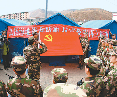 青海玉樹,名山之宗、三江之源、康巴之鄉。這里的雪山巍峨峻峭、雪蓮純潔無瑕、雪水晶瑩透明。 2010年4月14日7時49分。美麗的玉樹在大地無情的痙攣中猝然倒下,瞬間滿目瘡痍、轉眼支離破碎,數以萬計的高原兒女承受著撕心裂肺的苦痛。 這一刻,高原黑色之殤。銀峰低垂在渴盼,江河揮淚在祈求,草原無語在悵望…… 空中,穿破云雨冰雪。中國共產黨人以第一速度趕來了,朝著目標——挺進!挺進!挺進! 陸上,踏著顫抖大地。中國共產黨人在第一時間趕到了,凝聚力量——救人!救人!救人! 玉樹在哭泣,每一個中國共產黨人都在與時間爭命。青海在震栗,每一個中國共產黨人都在同死神角力。他們中間有干部,有人民子弟兵,有公安民警,有救援隊員,有醫生,有教師,有工人,有農民,有學生……他們中間有的在地震中痛失親人,來不及撫平悲傷,通宵達旦搶送傷員;有的忍受著自身傷痛,堅守在工作崗位上;有的跋山涉水趕至玉樹,忍受著高原反應的折磨,全力投入抗震救災……中國共產黨人選擇了把一切都獻給人民,以堅定的信念、無畏的氣概、鋼鐵的紀律,成為抗震救災的先鋒隊、災區人民的主心骨、受災群眾的貼心人。 站在闊遠高原,走進神秘雪域。中國共產黨人無論在哪里,就為哪里帶來陽光和春風—— 就像點燃的酥油燈,照亮高原所有的希望;就像燦爛的格桑花,綻放人間所有的祝福…… 這,就是人民哺育的共產黨人! “在這一困難時刻,我需要盡快趕回國內,同我國人民在一起,投入抗震救災工作。” 和人民同甘苦 與人民共患難 玉樹地震突襲而至,大地悲歌再起。 一個個鮮活的生命被廢墟掩埋,一雙雙清澈的眼睛被淚水遮蔽,一片片城鎮鄉村被夷為平地。 災情就是命令!中國共產黨人的雙腳就是春的萌動。 時間就是生命!中國共產黨人的雙手就是生的希望。 人民高于一切!中國共產黨人的雙肩就是愛的力量。 災害臨頭,中國共產黨人和人民心心相系。 “在這一困難時刻,我需要盡快趕回國內,同我國人民在一起,投入抗震救災工作。”正在國外訪問的胡錦濤主席果斷決策壓縮出訪行程提前回國。 4月17日14時20分許,經過近25個小時長途飛行后,胡錦濤總書記回到北京。16時,立即主持召開中央政治局常務委員會會議,全面部署抗震救災工作。 4月18日,抗震救災關鍵時刻。胡錦濤總書記飛抵玉樹地震災區。在扎西大同村、在玉樹州體育場、在扎西科村……總書記的手與災區群眾牢牢握在一起,總書記的心與災區群眾緊緊貼在一起。 “我相信,只要我們發揚偉大抗震救災精神,團結一心,眾志成城,就一定能夠奪取抗震救災斗爭的勝利!”胡錦濤總書記堅定鏗鏘的話音,在高原上空久久回蕩。 吳邦國、溫家寶、賈慶林、李長春、習近平、李克強、賀國強、周永康等中央領導同志情牽玉樹震區、心系災區人民。 災害臨頭,中國共產黨人和人民手手相挽。 中共中央組織部4月14日、15日連續發出通知,要求災區各級組織部門在黨委領導下,迅速動員和組織廣大基層黨組織和黨員干部立即投入到抗震救災工作中去;要求災區各級黨委、基層黨組織和廣大黨員堅決貫徹黨中央、國務院的決策部署,全力做好現場救援、災民安置、社會維穩等各項工作,在抗震救災中充分發揮領導核心、戰斗堡壘和先鋒模范作用。同時,連續兩次給青海省下撥黨費共500萬元,送去了黨中央對地震災區的殷切關懷。 青海省委、省政府在第一時間作出地震應急一級響應,組織動員全省各級黨組織和黨員干部投入抗震救災工作,以最快的速度全力搶救被困群眾,救治受傷人員,充分發揮領導核心、戰斗堡壘和先鋒模范作用。 青海省委組織部快速響應、迅速行動,健全和新成立受災群眾安置點黨組織,在抗震救災一線發展黨員,抽調60名黨員領導干部趕赴災區,把黨的旗幟打出來。 1小時、1分鐘、1秒鐘…… 服從黨的領導和人民的利益,中國共產黨人緊急行動,沖鋒在抗震最前列,筑起震不垮的堅強堡壘。 1秒鐘、1分鐘、1小時…… 聽從黨的指揮和人民的召喚,中國共產黨人緊急救援,戰斗在救災最前沿,筑起壓不塌的戰斗堡壘。 在房倒屋塌的村莊里,一個個挺身而出的共產黨人、一個個迎難而上的共產黨人集聚起來——他們抖去滿身塵土、擦去傷口血跡,來不及料理親人的后事,動員組織群眾搏斗災難,在災情最嚴重的地方挽救危亡中的生命,在災害最危險的地方尋找煎熬中的幸存者。 在斷瓦殘垣的廢墟前,一個個舍生忘死的共產黨人、一個個百折不撓的共產黨人沖鋒在前——他們從四面八方而來,與當地黨員干部和群眾一道,以尋找生還者為最大目標,一次次細致的搜索、一遍遍拉網式勘查,全然不顧劇烈的高原反應,渾然不覺寒冷與饑餓。 在災情最嚴重的地方,一個個愈挫愈奮的共產黨人,一個個愈戰愈勇的共產黨人勇不退縮——他們克服余震威脅,主動承擔起最艱苦的工作,深入村組、農戶,安撫群眾、搜集災情、排查隱患,組織群眾開展自救,把黨的溫暖送到每戶受災群眾。 在受災群眾的帳篷中,一個個有血有肉的共產黨人、一個個有情有義的共產黨人熱血沸騰——他們視受災群眾為親人,為災區群眾送來水米充饑、拿來衣被御寒、捧來愛心送暖,確保有飯吃、有衣穿、有水喝、有帳篷住、有病能及時醫治。 “黨員突擊隊”“黨員救援隊”“黨員應急小分隊”“黨員交通搶險隊”“黨員醫療救援隊”…