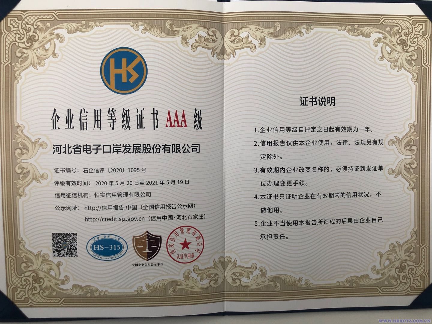 2020年5月,河北省電子口岸發(fā)展股份有限公司榮獲“企業(yè)信用等級證書AAA級”(最高級),并在全國信用報告公示網(wǎng)、信用中國·河北石家莊網(wǎng)站中公示。