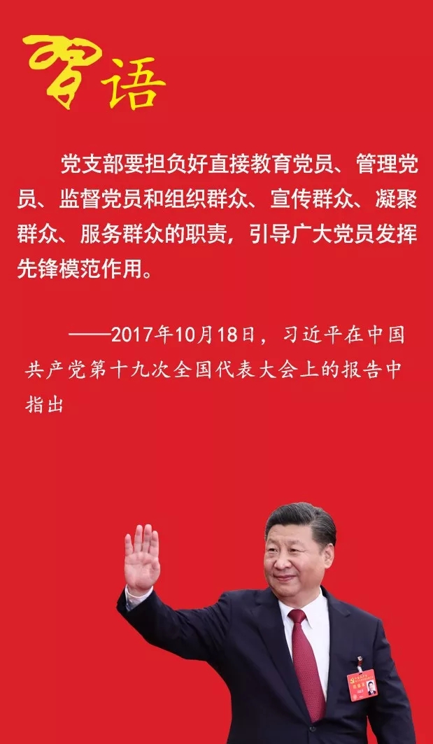 習(xí)近平總書記在十九大報(bào)告中強(qiáng)調(diào),黨支部要擔(dān)負(fù)好直接教育黨員、管理黨員、監(jiān)督黨員和組織群眾、宣傳群眾、凝聚群眾、服務(wù)群眾的職責(zé)。這是我們黨首次在黨的全國代表大會(huì)報(bào)告中明確界定黨支部的職責(zé)任務(wù)。